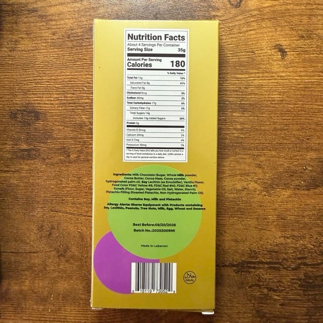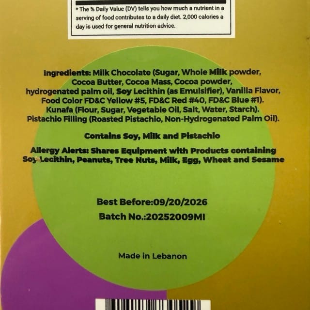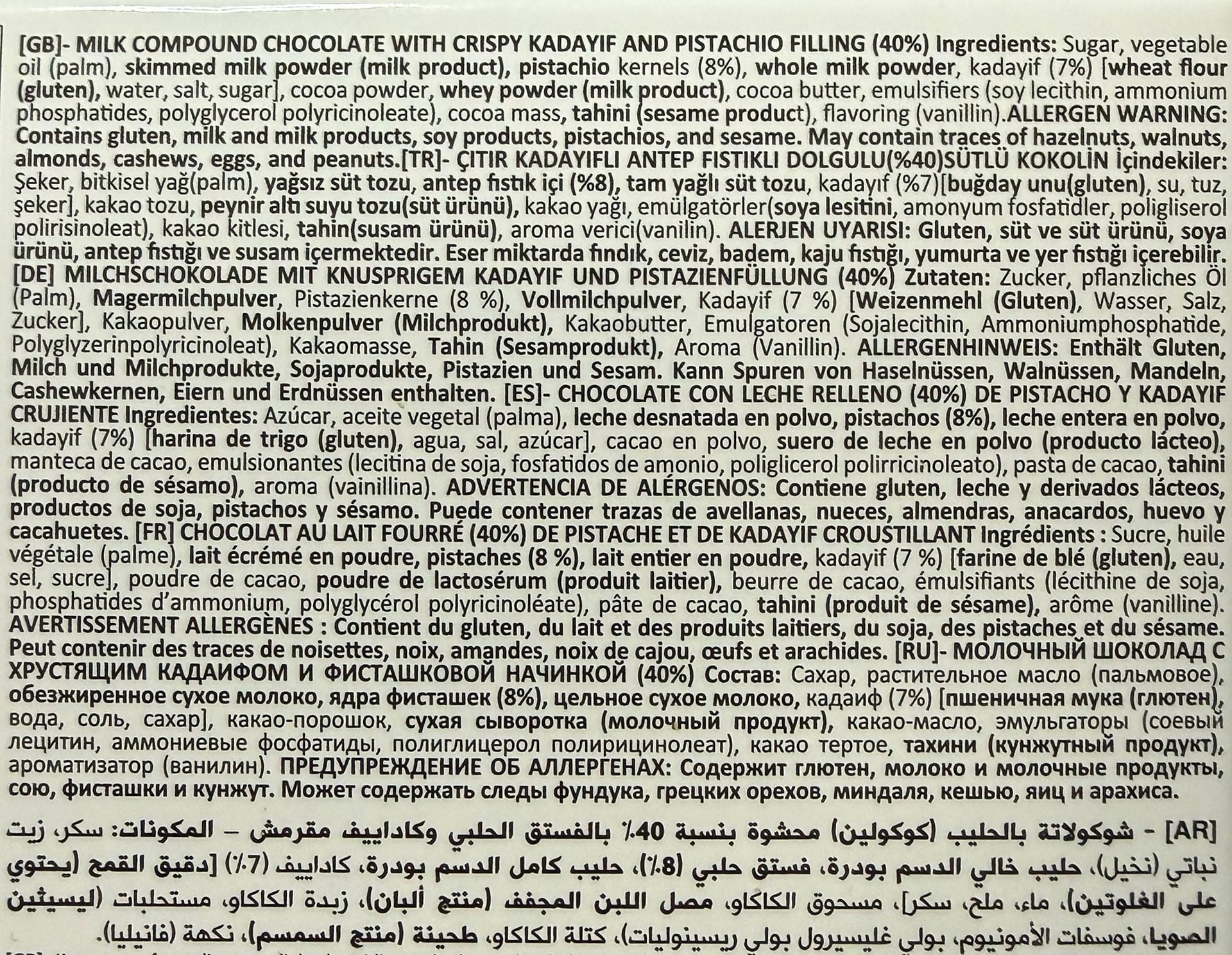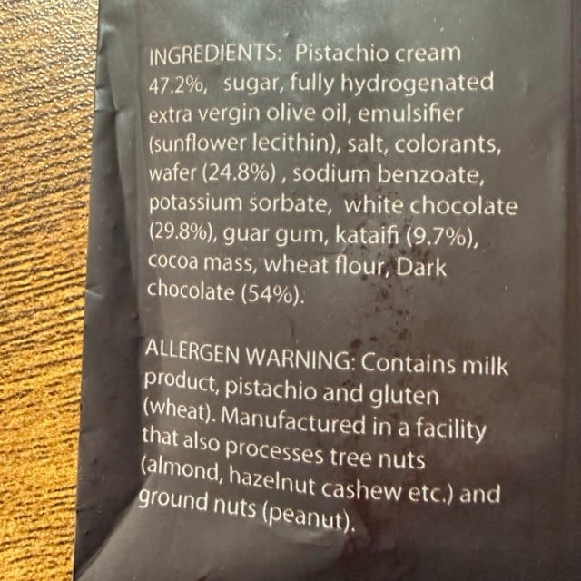 The filling (that which makes a genuine Dubai Chocolate bar a genuine Dubai Chocolate bar and not a “Dubai-style,” “chocolate” candy/confection) consisted of: