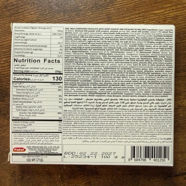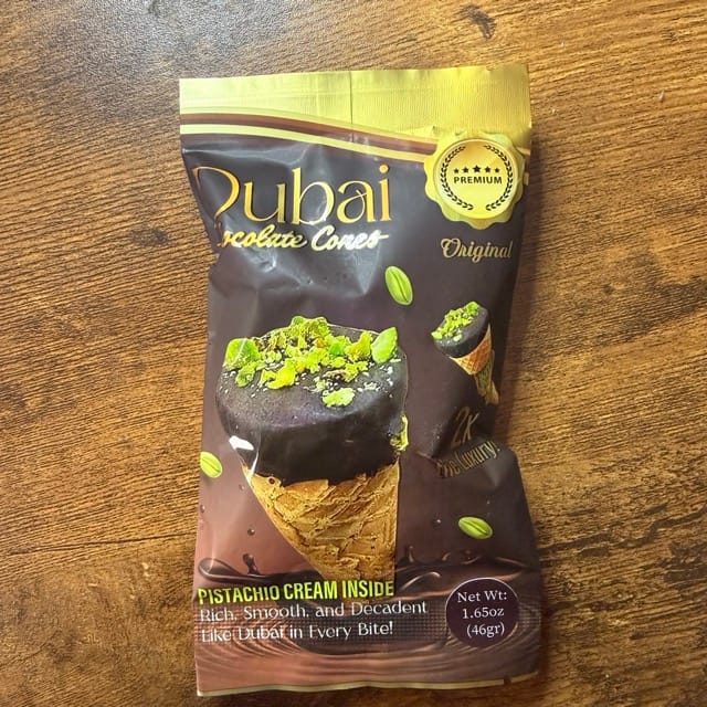 - Crave Dubai Chocolate Cones: D. The texture and flavor of the cone overwhelm the shredded phyllo, and if you weren’t told there was pistachio in it, you probably would not taste it. The product inside does not at all look like the image on the label, and the ingredient list on the back label is not legal in the US. The idea is cute – the execution leaves a lot to be desired.