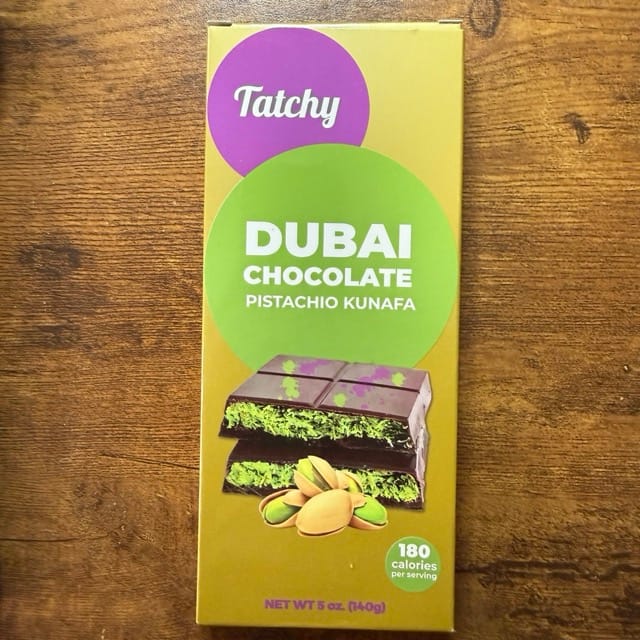 - Tatchy Dubai Chocolate Pistachio Kunafa: C. The taste and texture are the best of the three entrants here, which is why it gets a comparatively higher rating. But the bar is badly constructed; the thickness of the chocolate shell (and, consequently, the thickness of the filling) varies greatly, and so it’s possible to get a bite with virtually no filling in it. The “chocolate” does contain palm oil, making it legally not chocolate. The texture is more like feuilletine crisps than shredded phyllo, and it’s also too sweet.