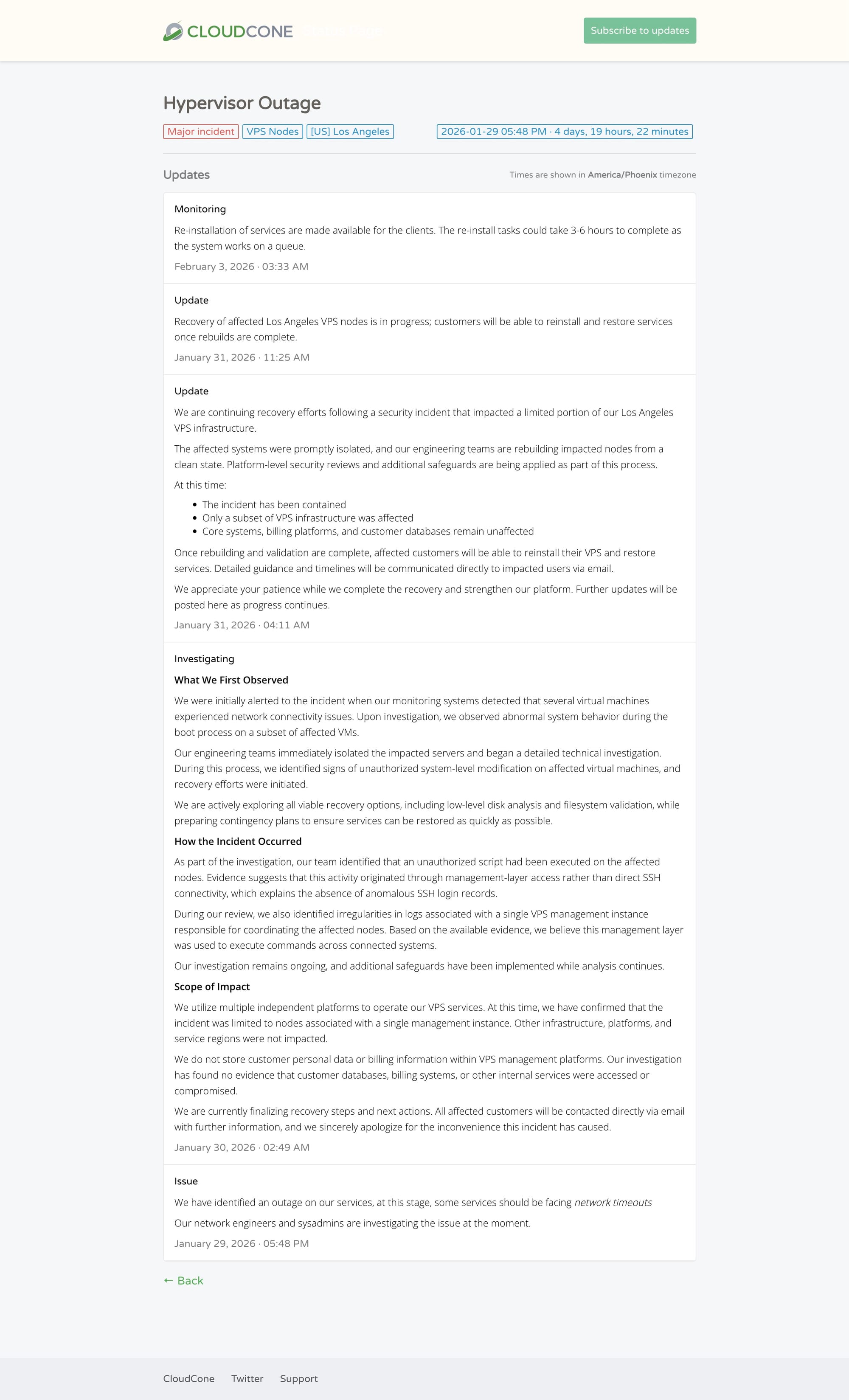 Reading between the lines of the update published approximately 8 hours after the incident was first reported (see below), a malicious script was uploaded to the node where my virtual server was located. That script apparently did two things: overwrote boot records and encrypted data on all the disks on the node. (Ransomware?)
