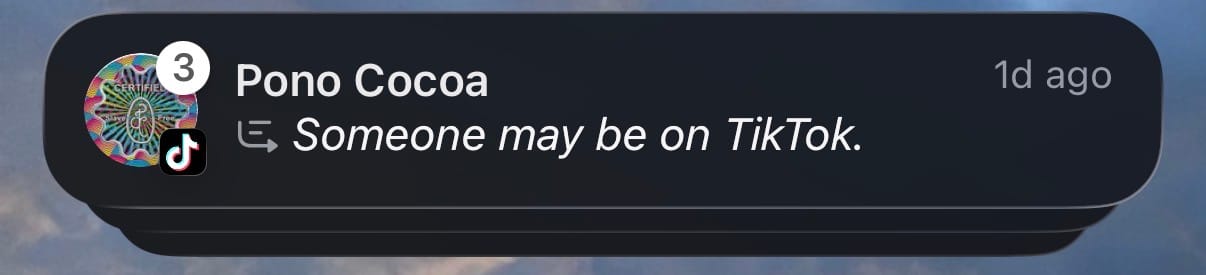 [TL]: The Tiktok notification I received. [TR]: From the Pono Cocoa Facebook page. [BL]: Instagram. [BR]: LinkedIn.