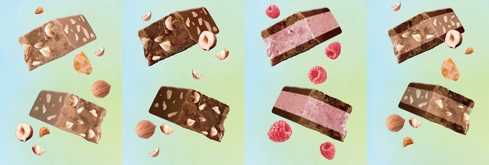 There are two expressions of the format: truffle bars and truffle layer bars. The truffle layer bars comprise three layers: a filling layer sandwiched between two chocolate layers, as can be seen in the photo lineup. The bars are not enrobed.