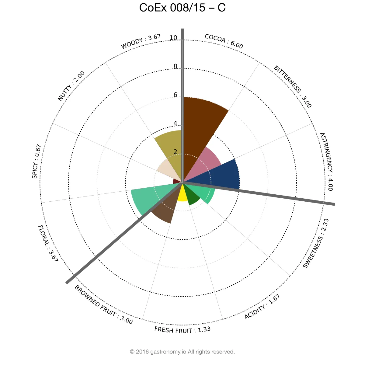 Since the 2015 round, I am proud to have had a direct involvement in the International Cocoa Awards through the creation of an alternative to spider graphs for communicating about flavor in cocoa and chocolate. That alternative visualization is shown in the listing image and was co-created by my colleague Ilya Sterin. The graphs have also been used by Lutheran World Relief in their Central American flavor mapping project and have been used in presentations at the Salon du Chocolat, Chocoa, and FCIA, among others, and are starting to be used by chocolate makers using cocoa beans recognized by the CoEx program. The development of these graphs is a part of my long-standing interest in improving communicating about flavor.
