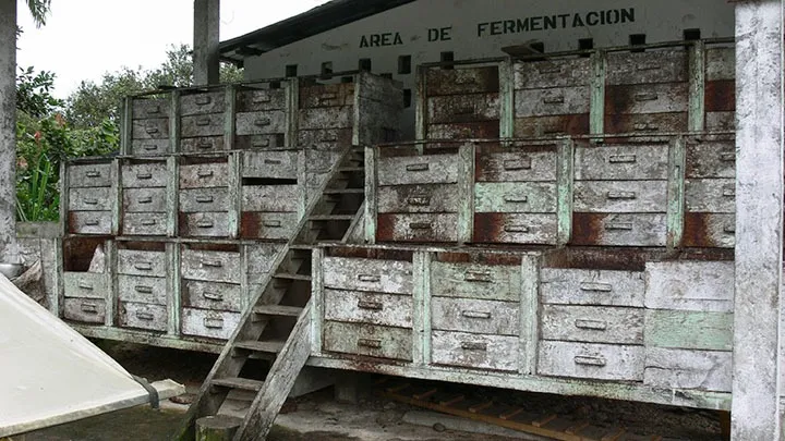 I've opted for fermentation in new plastic injection-moulded drums, 100 liters in size. We burn holes, using a heated 6mm rod, in the bottom and sides to allow good drainage. Drums are raised off the ground, on bricks, inside a storage room, and the process is checked by cutting beans every time we turn the batch.